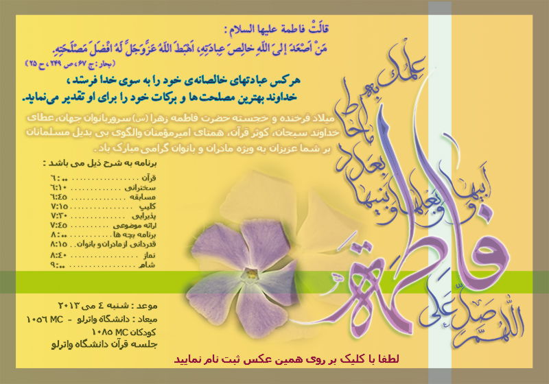 As we announced earlier, we will have an event to celebrate the birthday of lady Fatemah Zahra (A.S). The program will be held on campus as follows: